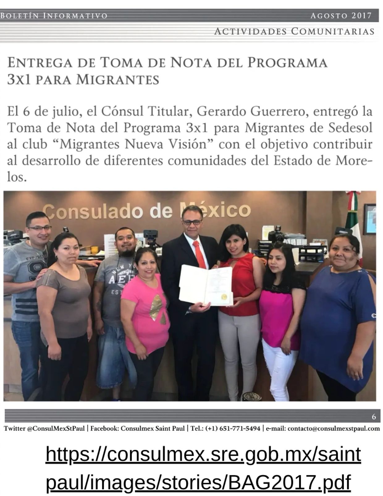 En julio de 2017, el Consulado de México en Saint Paul entregó oficialmente la Toma de Nota al club “Migrantes Nueva Visión”, inscrito dentro del Programa 3x1 para Migrantes de SEDESOL. Con ello, se presentó públicamente como una organización con el objetivo de apoyar a las comunidades de Morelos.