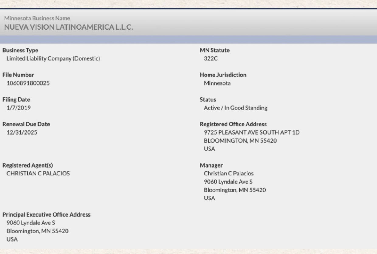 En 2019, sin explicación clara, Migrantes Nueva Visión dejó de ser un non-profit para transformarse en Nueva Visión Latinoamérica L.L.C., una empresa privada registrada en Minnesota. El cambio resulta extraño: como non-profit estaba obligada a transparentar ingresos y actividades, mientras que bajo la figura de LLC ya no tenía que rendir cuentas al público. ¿Fue miedo a exponer sus finanzas? ¿Una forma de proteger ingresos que no podía lucrar legalmente? ¿O una estrategia para blindar posibles fraudes dentro de una empresa privada?